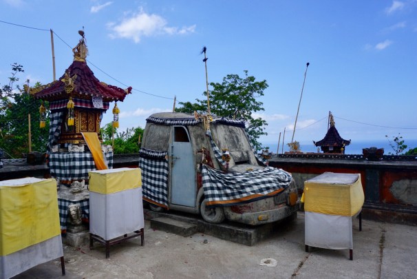Bevor es überhaupt auch nur ein einziges Auto in diesem kleinen Dorf auf Penida gegeben haben soll, hatte ein Bewohner die Eingebung, dass ein Auto voller Medizin kommen würde, um die kranken Menschen zu heilen. Zuvor hatte aber noch nie jemand ein Auto gesehen, geschweige dem gewusst, dass es so etwas gibt. Tatsächlich kam das vorhergesehene Auto in das Dorf und brachte den Menschen Medikamente. Heute betet man vor dem steinernen Abbild des vorhergesehenen Autos, dass alle Wünsche erfüllen soll, wenn man sie nur niemandem verrät.