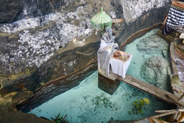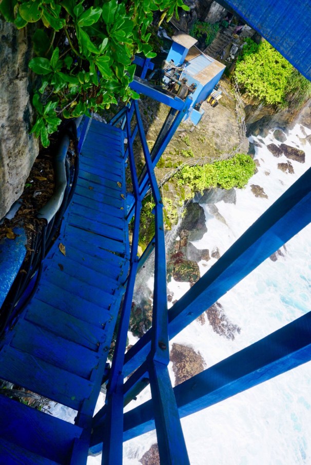 Siebenhundert blaue Stufen, die teilweise eher einer wackeligen Leiter gleichen, führen zu einem Tempel und Naturbecken mit heiligem Wasser.