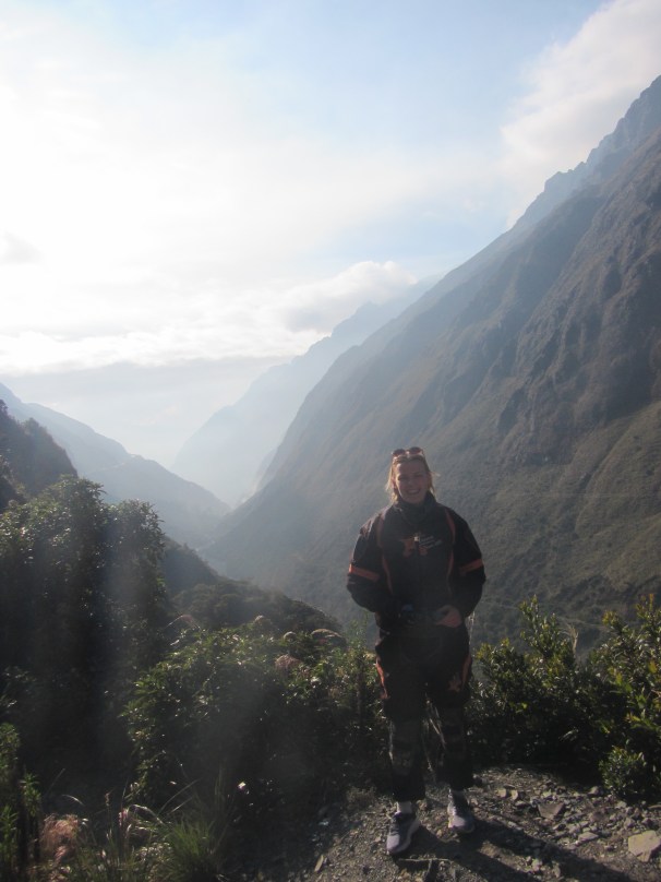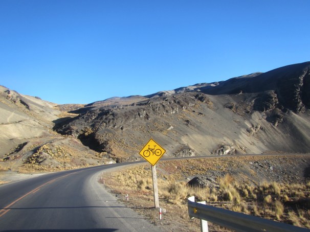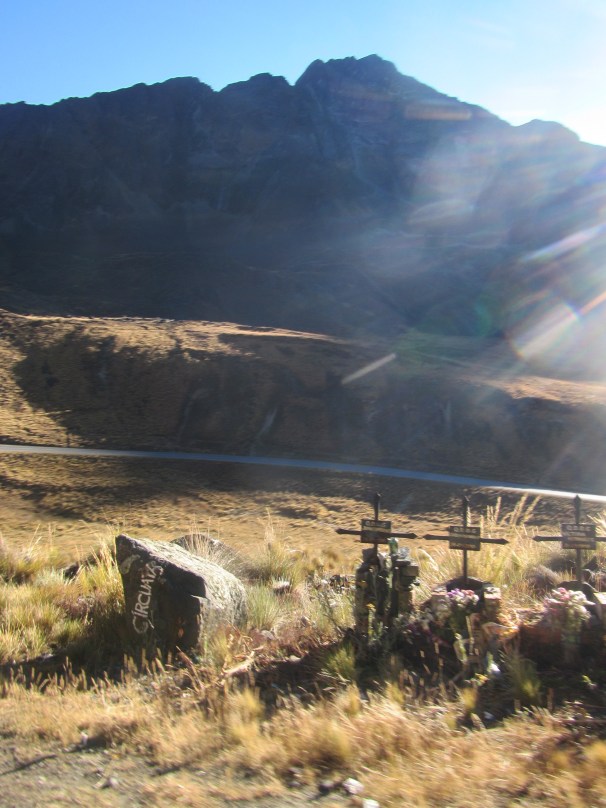 Die ersten 8 Kilometer fahren wir also auf dieser wunderbar glatt asphaltierten Straße. Der eisige Winter schlägt in mein Gesicht. Die Aussicht ist atemberaubend. Die Morgensonne wärmt meine eingefrorenen Finger langsam auf, ich sehe die rauhen Berge um mich herum. Kurve um Kurve schlängelt sich Straße Richtung Yungas, die ich plötzlich hinter der nächsten Kurve erblicken kann. Sattes dunkelgrün erstreckt sich über das gesamte Tal. Am Straßenrand warnen uns die ersten Kreuze von Verunglückten.