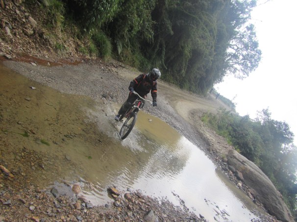 Ungefähr alle 15 bis 20 Minuten legen wir kleine Stopps ein. Damian erklärt uns dann, was uns auf der nächsten Etappe erwarten wird. Das Ganze untermalt er immer wieder mit den Namen, der jeweiligen Etappen. „Gleich kommen wir zum Cementerio (Friedhof). Hier ist ein Bus mit 60 Personen abgestürzt. Wundert euch also nicht über die unzähligen Kreuze am Wegrand.“ Oder „Die nächsten Kurven wurden nach den Nationalitäten der abgestürzten Mountainbiker benannt. Wir passieren gleich die bolivianische Ecke, die britische, die israelische, die deutsche…“ Moment mal! Fahrradfahrer sind hier auch abgestürzt?! Ich dachte das waren nur die ungeübten Autofahrer. Die Gruselgeschichten sind definitiv da, um uns zur Vorsicht und weniger Leichtsinn anzuhalten. Und es funktioniert. Die Konzentration ist geschärfter denn je.
