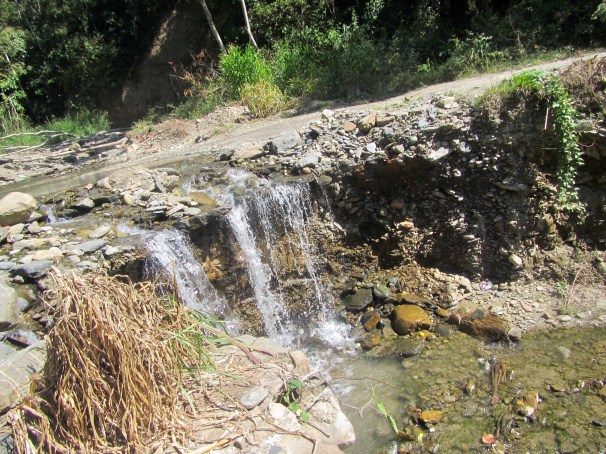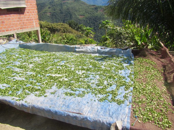 Uhrzeit?: Die letze Etappe führt auf einer gemütlich breiten steinigen Straße tiefer ins Tal. Inzwischen ist es noch feuchter und die Mittagssonne prallt auf uns. Die Straße führt an vielen Cocaplantagen vorbei.